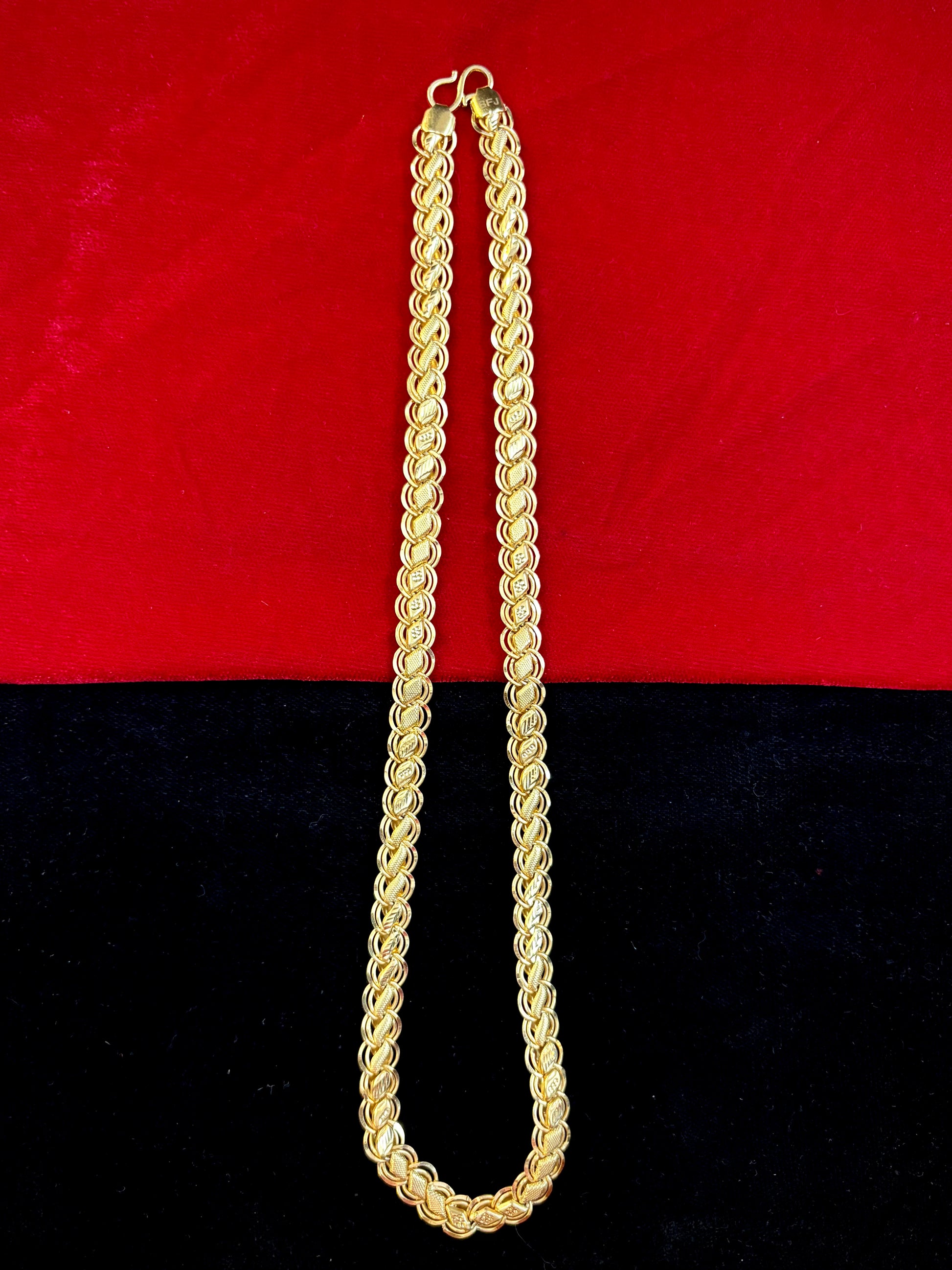 Add a touch of elegance to your collection with this beautifully crafted 1 gram gold plated lotus chain, featuring 150 milligrams of gold forming for enhanced durability. Weighing 20 grams, this chain offers a substantial feel while maintaining a refined, lightweight design.